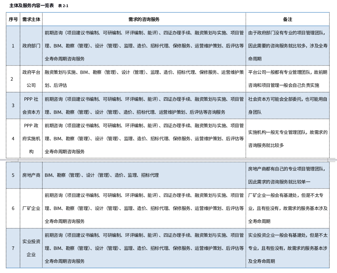 不同的投資主體對(duì)全過(guò)程咨詢(xún)需求的服務(wù)內(nèi)容是不一樣的,一是因?yàn)橥顿Y主體本身性質(zhì)的不同,法律法規(guī)所規(guī)定的也不一樣,二是投資主體自身團(tuán)隊(duì)管理水平的因素所需求的咨詢(xún)服務(wù)也不一樣,以下通過(guò)表格列述不同的主體所需求的咨詢(xún)服務(wù):