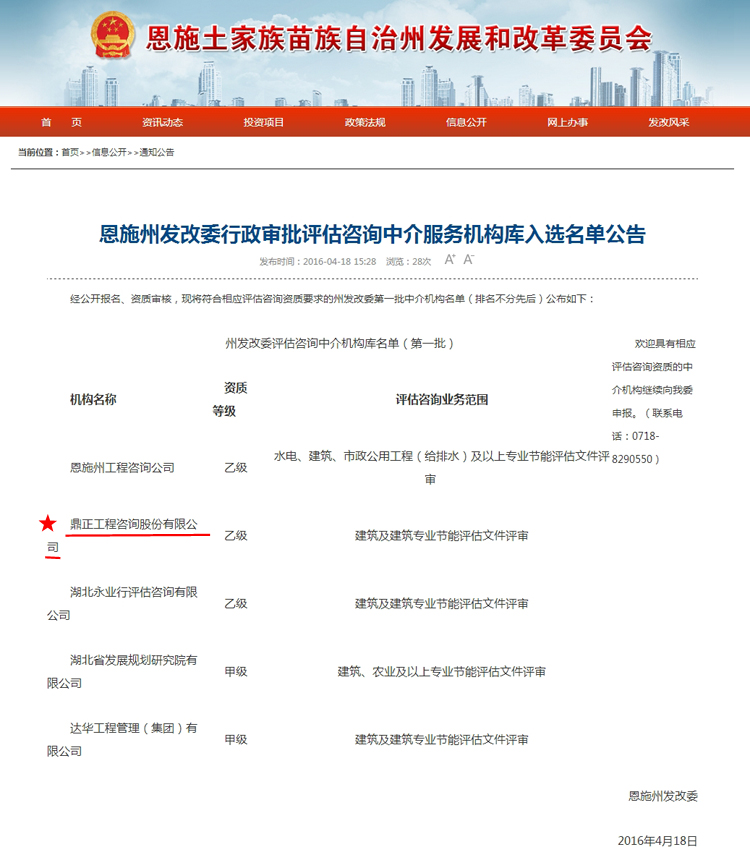 【經營成果】我司入圍恩施州發改委行政審批評估咨詢中介服務機構庫