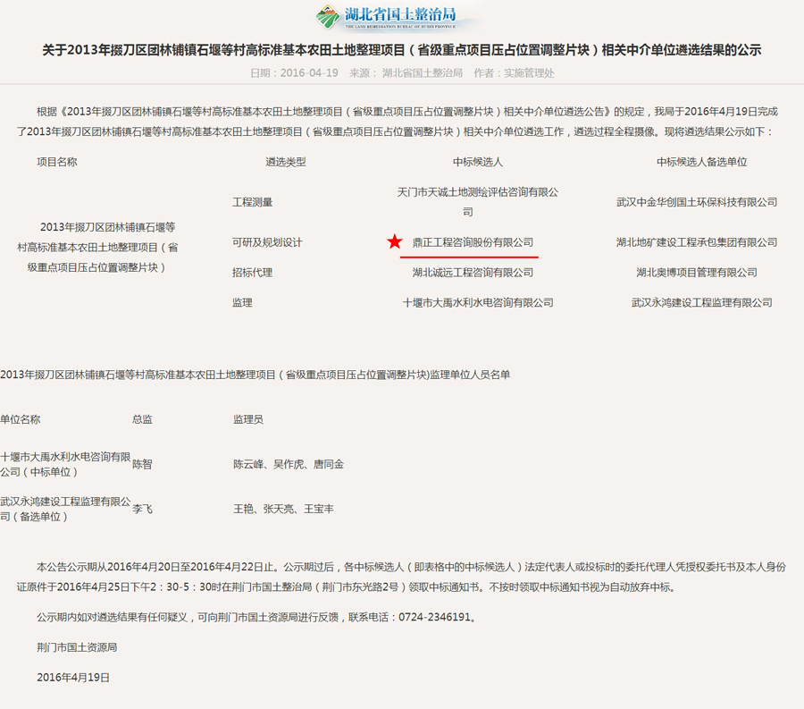 【經營成果】我司入選2013年掇刀區團林鋪鎮石堰等村高標準基本農田土地整理項目(省級重點項目壓占位置調整片塊)相關中介單位