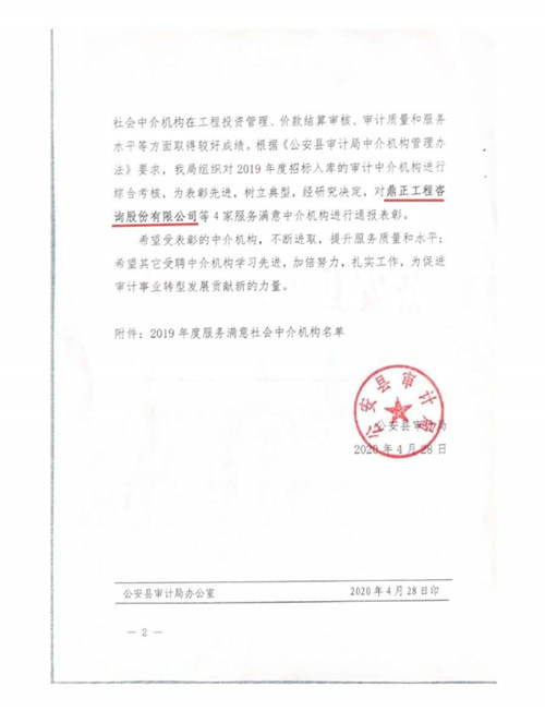 自2019年7月1日鼎正咨詢成為公安縣審計(jì)局的入庫合作單位以來,荊州分公司同事們?cè)诠こ炭⒐そY(jié)算審計(jì)過程中,精心組織、合理安排、嚴(yán)于律己、廉潔從審,在確保重點(diǎn)工程順利推進(jìn)、節(jié)約政府資金、提高投資效益等方面做出了突出貢獻(xiàn),得到了公安縣相關(guān)單位的一致好評(píng),為公司贏得了信譽(yù)。