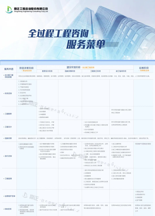 鼎正咨詢(xún)資質(zhì)資信及業(yè)務(wù)能力已覆蓋工程咨詢(xún)?nèi)a(chǎn)業(yè)鏈,可提供全過(guò)程工程咨詢(xún)、PPP全生命周期咨詢(xún)、項(xiàng)目策劃、工程投資咨詢(xún) 、土地利用規(guī)劃、城鄉(xiāng)規(guī)劃、工程設(shè)計(jì)、工程監(jiān)理、招標(biāo)代理、政府采購(gòu)、工程造價(jià)咨詢(xún)、BIM咨詢(xún)等服務(wù)。